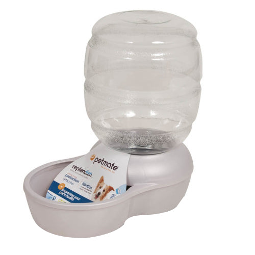 Product Description Petmate Replendish Waterers with Microban provide a continuous flow of filtered water so busy pet parents have fewer refills to make and pets stay hydrated with cool, clean water anytime twenty-four hours a day. Ideal for short stays away from home. The base features Microban Antimicrobial Protection that helps to prevent the growth of stain and odor-causing bacteria. This protection provides an additional level of defense against damaging microbes. Made of PET plastic making it safe for your pets. Easy to clean wide mouth bottle and base. Great for multiple pet households. Includes a charcoal filter that removes waterborne pathogens. Made in the USA. Product Benefits Ingredients Suggestions Special Note Warnings DisclaimerPeta2z.com offers nationally branded products that are produced according to manufacturing standards set by regulators at everyday low prices. Do not use unproven, unbranded products, which can pose serious risks to your health.