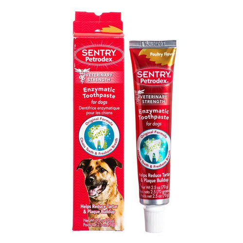 Product Description Petrodex Enzymatic Pet Toothpaste is formulated specifically to help control plaque and fight bad breath for dogs. It does not foam and doesn't need to be rinsed! With the delicious poultry flavor, your dog will love getting his teeth brushed. Original formula enzymatic toothpaste for dogs Helps reduce tartar and plaque buildup Cleans teeth and freshens breath Dental care is just as important for your dog as it is for you. Dry food and chew toys help clean some of your pets teeth, but they don't replace brushing at the gumline where most dental problems begin. Introducing your pet to brushing is not at all difficult; it only takes a few minutes a day and can add years to your pets life.For amazing results use with a Petrodex dual-ended toothbrush, specially tapered to conform to your pets mouth.Ingredients: Sorbitol, Water Purified, Di Calcium Phosphate, Hydrated Silica, Glycerine, Poultry Digest, Dextrose, Xanthan Gum, Sodium Benzoate, Glucose Oxidase. Product Benefits Ingredients Suggestions Special Note Warnings DisclaimerPeta2z.com offers nationally branded products that are produced according to manufacturing standards set by regulators at everyday low prices. Do not use unproven, unbranded products, which can pose serious risks to your health.