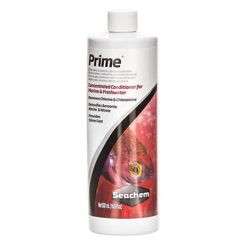 Product Description Prime is the complete and concentrated conditioner for both fresh and salt water. Prime removes chlorine, chloramine and ammonia. Prime converts ammonia into a safe, non-toxic form that is readily removed by the tank's biofilter. Prime may be used during tank cycling to alleviate ammonia/nitrite toxicity. Prime detoxifies nitrite and nitrate, allowing the biofilter to more efficiently remove them. Prime also promotes the production and regeneration of the natural slime coat. Prime is non-acidic and will not impact pH. Prime will not overactivate skimmers. Use at start-up and whenever adding or replacing water. As part of their ongoing environmental stewardship efforts Seachem will donate a portion of the profits for every specially labeled edition bottle of Prime, Stability, Pristine, and Clarity (in Bonus Sizes of 325 mL -- 30% more) sold to a Rhino preserve in South Africa. GET MORE FOR THE SAME PRICE! See Product ID: 67104300 for 325ml for the price of 250ml (that's 30% more FREE!). Product Benefits Ingredients Suggestions Use Instructions:Use 1 capful (5 ml) for each 200 L (50 US gallons) of new water. For smaller volumes, please note each cap thread is approximately 1 ml. May be added to aquarium directly, but better if added to new water first. If adding directly to aquarium, base dose on aquarium volume. Sulfur odor is normal. For exceptionally high chloramine concentrations, a double dose may be used safely. To detoxify nitrite in an emergency, up to 5 times normal dose may be used. If temperature is > 30 °C (86 °F) and chlorine or ammonia levels are low, use a half dose. Special Note Warnings DisclaimerPeta2z.com offers nationally branded products that are produced according to manufacturing standards set by regulators at everyday low prices. Do not use unproven, unbranded products, which can pose serious risks to your health.