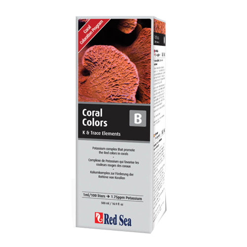 Product Description The Reef Colors program Provides the minor and trace elements that are taken up by the coral skeleton and soft tissue and are essential for SPS corals to display their natural colors. Reef Colors B is a Potassium complex that promote the red colors in corals. Product Benefits Ingredients Suggestions Use Instructions:1ml will raise the potassium level of 100 liters (25 gal) by1.75ppm Special Note Warnings DisclaimerPeta2z.com offers nationally branded products that are produced according to manufacturing standards set by regulators at everyday low prices. Do not use unproven, unbranded products, which can pose serious risks to your health.