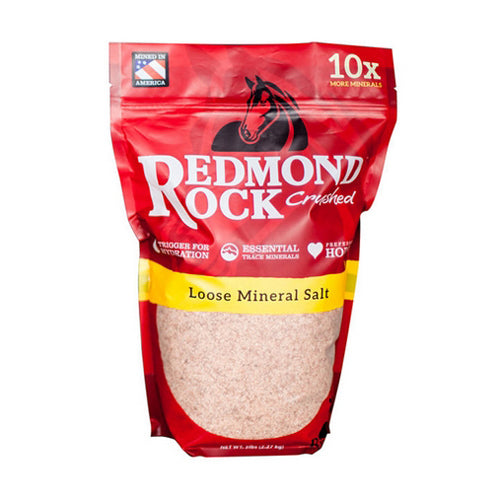 Product Description Essential trace minerals and electrolytes in a natural blend only nature could have made. Increases stamina, aids digestion, improves vitality and boosts energy. Product Benefits Preferred By Horses. Horses Love Redmond Rock. Ingredients Suggestions Directions: Feed free choice year-round. Provide plenty of fresh, clean water. When first introducing, encourage licking by pouring water or molasses on rock. Rock-on-a-Rope is ideal for barn, stall or fence post. Tie tight for easy licking, or give slack for a healthy alternative to candy balls and other boredom busters. Outdoors, tying Rock-on-a-Rope to a fence keeps rock out of dirt and mud, and tying it lower on a gate allows horse to maintain the posture horses naturally assume when foraging. Directions-1: Normal recreation - 1 scoop daily Performance horse - 2 scoops daily. Scoop enclosed. Resealable pouch. Rock Crushed with Garlic is a completely natural granular mineral sea salt. Contains a complete balance of over 60 trace minerals, plus the pest repelling power of garlic. Supports good gut health. Proven electrolyte replacement encourages hydration and supports active horses is energy demands. Contains 0.35% calcium, 0.002% phosphorous, 90% salt, 0.06% magnesium, 0.03% potassium, 0.07% sulfur, 10 ppm iodine, 5 ppm manganese, 3 ppm copper and 1 ppm zinc. Directions-2 : For horses 300-600 lbs - 1/2 to 1 scoop; 600-1,200 lbs - 2 scoops; 1,300-2,000 lbs - 3 scoops. Scoop enclosed. Resealable pouch. Special Note Warnings DisclaimerPeta2z.com offers nationally branded products that are produced according to manufacturing standards set by regulators at everyday low prices. Do not use unproven, unbranded products, which can pose serious risks to your health.
