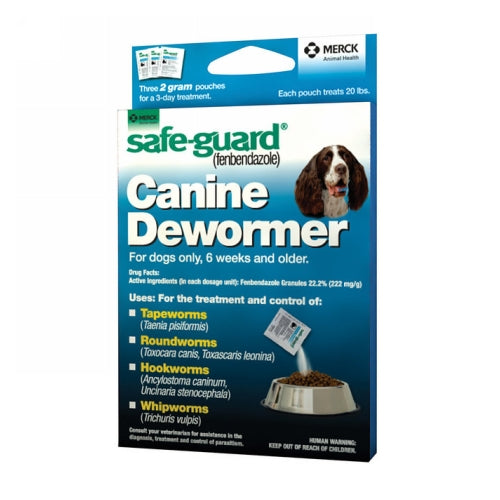 Product Description For the treatment and control of roundworms, hookworms, whipworms and taenia species of tapeworms in healthy puppies 6 weeks or older and adult dogs, including pregnant dogs. Contains fenbendazole 22.2%. Product Benefits At Least 98% Effective Safe For Puppies And Pregnant Females Available In Three Package Sizes To Suit Small, Medium And Large Dogs: Orange Package Contains Three X 1 Gram Fenbendazole Dewormer Granule Packets (Each Packet Treats 10 Lbs.); Blue Package Contains Three X 2 Gram Fenbendazole Dewormer Granule Packets (Each Packet Treats 20 Lbs.); And Dark Red Package Contains Three X 4 Gram Fenbendazole Dewormer Granule Packets (Each Packet Treats 40 Lbs.) Discover Safe-Guard Fenbendazole 22.2% (222 Mg/G) Dog Dewormer For Your Dogs Now! Ingredients Suggestions Special Note Warnings DisclaimerPeta2z.com offers nationally branded products that are produced according to manufacturing standards set by regulators at everyday low prices. Do not use unproven, unbranded products, which can pose serious risks to your health.