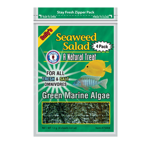 Product Description Seaweed Salad is a natural treat for your marine and freshwater herbivores. Our product is much more nutritious than spinach and lettuce. This is recommended for all freshwater Algae Eaters, African Cichlids, Silver Dollars, Sharks and all saltwater Damsels, Clownfish, Angels, and Tangs. Product Benefits Ingredients Suggestions Feeding Instructions:Tear or cut off a piece of Sally's Seaweed Salad approximately 3 inches by 3 inches (for an average stocked 30 gallon aquarium) using a vegetable clip, place inside your aquarium in an area easily accessible for your fish. Your fish will graze at their leisure. Remove all uneaten seaweed after 6-8 hours. Special Note Warnings DisclaimerPeta2z.com offers nationally branded products that are produced according to manufacturing standards set by regulators at everyday low prices. Do not use unproven, unbranded products, which can pose serious risks to your health.