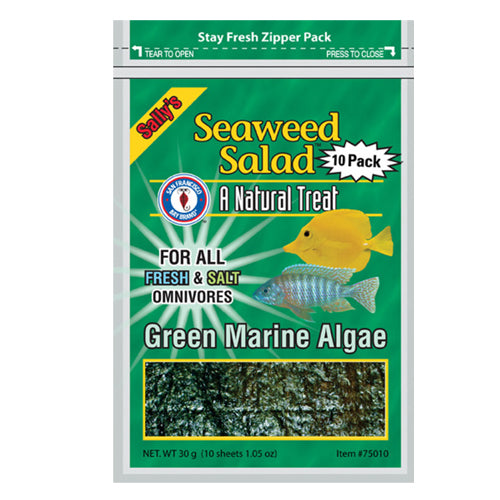 Product Description Seaweed Salad is a natural treat for your marine and freshwater herbivores. Our product is much more nutritious than spinach and lettuce. This is recommended for all freshwater Algae Eaters, African Cichlids, Silver Dollars, Sharks and all saltwater Damsels, Clownfish, Angels, and Tangs. Product Benefits Ingredients Suggestions Feeding Instructions:Tear or cut off a piece of Sally's Seaweed Salad approximately 3 inches by 3 inches (for an average stocked 30 gallon aquarium) using a vegetable clip, place inside your aquarium in an area easily accessible for your fish. Your fish will graze at their leisure. Remove all uneaten seaweed after 6-8 hours. Special Note Warnings DisclaimerPeta2z.com offers nationally branded products that are produced according to manufacturing standards set by regulators at everyday low prices. Do not use unproven, unbranded products, which can pose serious risks to your health.