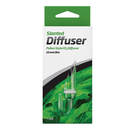 Product Description The Slanted Diffuser is a pollen style CO2 diffuser that connects to CO2 injection systems to easily and uniquely disperse CO2 gas into the planted aquarium. The elegant and low profile design of the slanted diffuser makes it ideal to minimize the visibility and intrusiveness of the CO2 injection system on planted tanks. The Slanted Diffuser has a 15 mm disc. Product Benefits Ingredients Suggestions Assembly Instructions:1. Rinse glassware with warm water. Attach suction cup and desired tubing (Compatible with 6 mm (1/4) - Standard Airline Tubing) to the diffuser.2. To attach tubing to glassware, wet the inside of the tubing with water at the attachment point and carefully slide tubing over glass. The use of other lubricants is not advisable as these usually make the tubing slide off of the glassware too easily. To avoid breakage when removing tubing, do not pull tubing off of glassware. Instead, cut tubing carefully along the attachment length to release the glassware.3. Mount your diffuser using the suction cup(s). It should be positioned low in the aquarium. When removing or repositioning the diffuser, pull by the suction cup(s) rather than the glass to avoid breakage.4. Install check valve (not included) inline with tubing outside of the aquarium5. Once securely mounted, turn on CO2. Observe bubble count and adjust CO2 to desired flow rate. Some of Seachem’s diffusers have a bubble counting feature. Otherwise a separate Seachem glass Bubble Counter is available. Special Note Warnings DisclaimerPeta2z.com offers nationally branded products that are produced according to manufacturing standards set by regulators at everyday low prices. Do not use unproven, unbranded products, which can pose serious risks to your health.