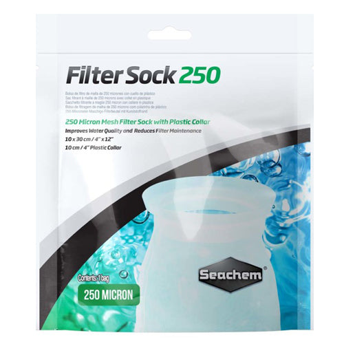 Product Description Filter Sock 250 Micron MESH- 4x12 Sock-Filter socks are a critical component in maintaining water quality in aquariums. They remove suspended debris and detritus, which often lead to excess dissolved organics, nitrate, and phosphate when left unchecked. This makes Seachem Filter Socks an integral addition to any sump and overflow system. This item is made of Polyester Mesh and stitched. Product Benefits Ingredients Suggestions Special Note Warnings DisclaimerPeta2z.com offers nationally branded products that are produced according to manufacturing standards set by regulators at everyday low prices. Do not use unproven, unbranded products, which can pose serious risks to your health.