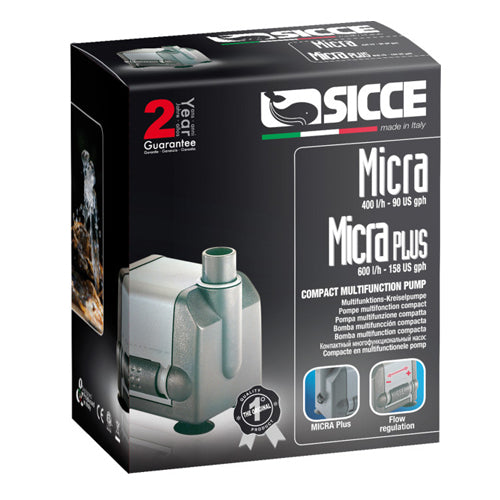 Product Description Pioneers of the industry, SICCE was the first manufacturer to release a compact range of synchronous motor pumps, which today still remain a point of reference for the global market. The MICRAPLUS has been copied countless times, but never duplicated. The energy efficient MICRAPLUS is a completely submersible recirculation pump for every type of aquarium. Product Benefits Ingredients Suggestions Special Note Warnings DisclaimerPeta2z.com offers nationally branded products that are produced according to manufacturing standards set by regulators at everyday low prices. Do not use unproven, unbranded products, which can pose serious risks to your health.