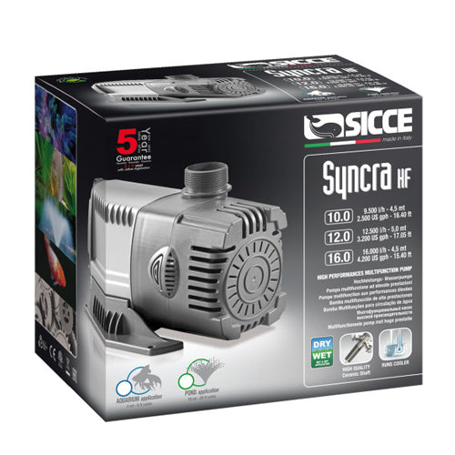 Product Description Syncra High Flow pumps are engineered and tested to outperform pumps rated at much Higher flow at equal head pressures. The Syncra High Flow models, with all the great features of the Syncra line, incorporate new leading edge technologies that move them into a class all their own. This exclusive technology, combined with the new electronic engineering of the motor, assures optimized performances while maintaining low power consumption and maximum energy efficiency. The powerful permanent magnet synchronous motors ensure High energy efficiency and reliability for both submersed or external inline applications. Syncra HF pumps are engineered for a wide range of applications: gardens, fresh and salt water tanks, water cooling, above ground swimming pools, drainage, fountains and many other uses. Constructed with standard male threaded inlets and outlets for hook up with fittings for any installation. Available in three models that will save up to 50-percent of electrical costs over comparably rated pumps. Designed for real world applications thus optimizing flow and energy efficiency as head pressure increases. Product Benefits Ingredients Suggestions Special Note Warnings DisclaimerPeta2z.com offers nationally branded products that are produced according to manufacturing standards set by regulators at everyday low prices. Do not use unproven, unbranded products, which can pose serious risks to your health.