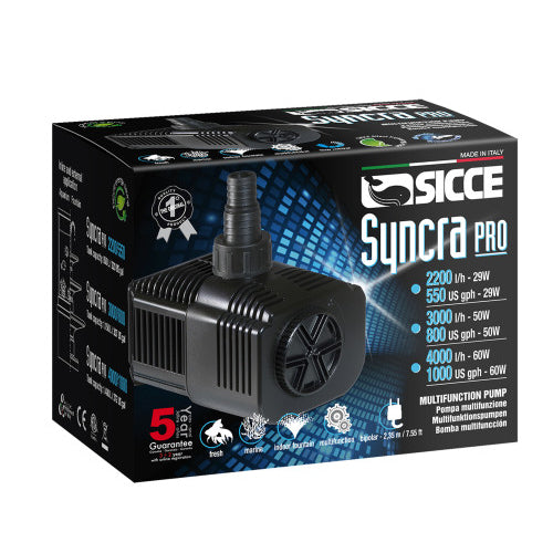 Product Description Syncra Pro: a new generation range of pumps, created to pair elevated performances with extreme silence and energy saving. Thanks to their innovative technology, these pumps can be used in a great number of different applications. In fact, Syncra Pro pumps are ideal for fresh water and marine aquariums, terrariums and turtle tanks, protein skimmers, water-cooling, indoor and outdoor fountains and for any other application that requires a high performance, extremely silent pump. Syncra Pro: design, reliability, 100% silence, fused with Sicce's superior technology. Product Benefits Ingredients Suggestions Special Note Warnings DisclaimerPeta2z.com offers nationally branded products that are produced according to manufacturing standards set by regulators at everyday low prices. Do not use unproven, unbranded products, which can pose serious risks to your health.