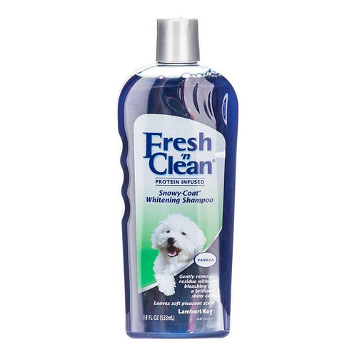 Product Description Lambert Kay Fresh 'n Clean Snowy Coat Whitening Shampoo is a unique pH-balanced shampoo, specially formulated to lusterize white coats. It also has conditioners to build body, help stop tangles, leave a natural sheen, and prevent skin and coat dryness. Refreshing vanilla scent Ideal for white, creams and light-color coats. Enhances natural color of dogs coat without bleaching. The pH balance is compatible with the natural pH balance of your pets skin and coat.Directions: For cats, dogs or puppies. Wet coat with warm water. Pour shampoo along pets back. Work shampoo into coat. Add more if needed. Rinse. Shampoo again. Rinse until water is free of suds. Product Benefits Ingredients Suggestions Special Note Warnings DisclaimerPeta2z.com offers nationally branded products that are produced according to manufacturing standards set by regulators at everyday low prices. Do not use unproven, unbranded products, which can pose serious risks to your health.