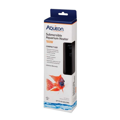 Product Description Aqueon submersible aquarium heaters are made from thermal shatter resistant quartz glass and designed to absorb impacts, making them extremely durable. An electronic thermostat stops heating once set temperature is reached. A power indicator light turns on when the unit is heating and is equipped with a 6-foot power cord. UL approved, the heater is also programmed to turn itself off when not properly submersed to avoid overheating and damage. This heater can be positioned at a vertical or horizontal angle and used in freshwater and saltwater aquariums. Wattage heaters are available in 50W, 100W, 150W, 200W and 300W. Aqueon products offers a wide range of items so that you can build and maintain a healthy aquatic environment. All the essentials from fish tanks, filters, lighting, food, care, and other supplies that your pet fish needs. We make it easy for you to get your first aquarium and to grow in the hobby as you become more of a fish expert with every step you take and every new thing you learn. Fully submersible, auto shut-off when overheats, resets when cools down. Electronic thermostat stops heating once set temperature is reached. Precise temperature setting adjustable to 1° F (68-88° F). Shatter-resistant Led light turns on when aquarium water is being heated, automatic safety shut off and overheat protection. For freshwater and saltwater aquariums up to 20 gallons. Product Benefits Ingredients Suggestions Use Instructions: Can be easily installed both vertically or horizontally using the included suction cups. Mounting Direction: Horizontal; Vertical. Special Note Warnings DisclaimerPeta2z.com offers nationally branded products that are produced according to manufacturing standards set by regulators at everyday low prices. Do not use unproven, unbranded products, which can pose serious risks to your health.
