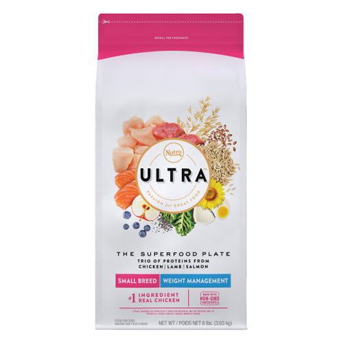Product Description NUTRO ULTRA believes that dogs deserve to enjoy their food as much as we enjoy ours. And like us, they shouldn’t have to compromise on taste. NUTRO ULTRA Adult Weight Management Dry Dog Food with a Trio of Proteins From Chicken, Lamb and Salmon is crafted using quality ingredients that satisfy and nourish. These delicious, protein rich recipes start with real chicken as the #1 ingredient and feature a trio of high-quality protein from chicken, lamb, and salmon and a blend of 15 vibrant superfoods like coconut, chia, kale, and blueberries. NUTRO ULTRA Adult Weight Management Recipe provides a balanced diet for adult dogs that’s nutrient rich and full of flavor that’ll help your dog thrive. Bring together unique ingredients and flavors to make your pet’s mealtime an extraordinary moment with NUTRO ULTRA Dog Food. All NUTRO ULTRA Dry Dog Foods follow the NUTRO FEED CLEAN philosophy, using high-quality, real ingredients sourced from trusted farmers and suppliers. These dry recipes are made with Non-GMO ingredients† and have no chicken by-product meal, corn, wheat, or soy protein and no artificial flavors, colors, or preservatives. Plus, these nutrient rich recipes designed for canines are full of flavor and have high-quality protein as the foundation of every recipe. † Trace amounts of genetically modified material may be present due to potential cross-contact during manufacturing. Contains one (1) 8 lb. bag of NUTRO ULTRA Small Breed Adult Weight Management Dry Dog Food with a Trio of Proteins From Chicken, Lamb and Salmon. Features trio of protein from chicken, lamb, and salmon—chicken is the #1 ingredient—specially formulated for overweight adult dogs to help with healthy weight management. Our premium, all natural dog food kibble is made with high-quality ingredients (plus vitamins, minerals, and other nutrients) and provides complete and balanced nutrition for adult dogs in every bowl. NUTRO ULTRA Dry Dog Food protects the integrity of the food at every stage of the process, sourcing from trusted farmers and suppliers, preparing only in trusted facilities and rigorously testing for quality and food safety. We will never add artificial preservatives†, flavors or colors. We will not use ingredients like chicken by-product meal, corn, wheat or soy protein† +Trace amounts may be present due to potential cross-contact during manufacturing. NUTRO ULTRA Dry Dog Food is made with high-quality ingredients carefully sourced from our trusted network of farmers and suppliers. +Trace amounts may be present due to potential cross-contact during manufacturing. Great Taste: Delicious Superfood Plate with a trio of proteins from chicken, lamb and salmon. Healthy Immunity: Essential Antioxidants to help support a healthy immune system. Proudly Produced in USA Facilities with the finest ingredients from around the world. Partnerships with trusted farmers and suppliers to source high-quality ingredients. NO CHICKEN BY-PRODUCT MEAL, CORN, WHEAT OR SOY† - No chicken by-product meal† - No artificial flavors or colors - No artificial preservatives† - No corn, wheat or soy protein† +Trace amounts may be present due to potential cross-contact during manufacturing. Product Benefits Ingredients Suggestions Special Note Warnings DisclaimerPeta2z.com offers nationally branded products that are produced according to manufacturing standards set by regulators at everyday low prices. Do not use unproven, unbranded products, which can pose serious risks to your health.