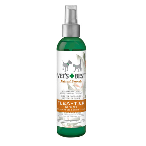 Product Description Vet's Best Flea and Tick Spray (8 oz) uses a unique blend of peppermint oil and eugenol (from clove plants) to kill fleas, flea eggs, and ticks by contact. Also repels mosquitoes! Our formulas are independently tested and proven effective at killing and repelling pests like fleas, ticks, and mosquitoes. For use on dogs and puppies 12 weeks or older. The non-staining plant-based flea and tick killing formula is also great for home surfaces like furniture, bedding, carpets, flooring, and curtains – anywhere these pests may hide! For over 30 years, Vet’s Best has blended plant-based ingredients that work together to comfort and protect your pet. VET's BEST FLEA AND TICK SPRAY: (8oz) kills fleas, flea eggs, and ticks by contact using certified natural essential oils and plant-based ingredients like peppermint oil and eugenol (from clove plants). Formula repels mosquitoes too!. SAFE TO USE FOR: dogs and puppies 12 weeks or older when used as directed. Can be applied indoors or outdoors. SOOTHING AND COMFORTING: Soothes dog's skin to leave them comfortable and smelling fresh. PRODUCT LINE FOR CATS: For flea and tick protection on cats, try our new Vet's Best line for cats. Product Benefits Ingredients Suggestions Special Note Warnings DisclaimerPeta2z.com offers nationally branded products that are produced according to manufacturing standards set by regulators at everyday low prices. Do not use unproven, unbranded products, which can pose serious risks to your health.