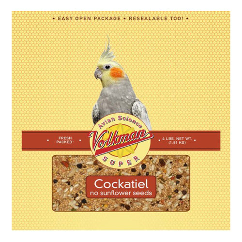 Product Description Volkman Avian Science Super Sunflower Seed-Free Cockatiel Food is a combination of healthy seeds, grains, fruits and veggies that’s free of sunflower seeds. It’s the perfect choice for small birds like Cockatiels, Senegals, Lovebirds, Conures and Parakeets. This mix is good for overweight Cockatiels and those on special diets because it contains no sunflower seeds, which are high in fat. Instead, your bird can enjoy a food full of nutritious diced carrot and papaya, shredded coconut, and canary grass seed, which has low fat content. Each Avian Science Diet blend has added vitamins, minerals, and amino acids for your birds health. Store in a cool dry place and refrigerate when opened to extend freshness. it's the perfect choice for small birds like Cockatiels, Senegals, Lovebirds, Conures and Parakeets. This mix is good for overweight Cockatiels and those on special diets because it contains no sunflower seeds, which are high in fat. Instead, your bird can enjoy a food full of nutritious diced carrot and papaya, shredded coconut, and canary grass seed, which has low fat content. Provides essential nutrients your bird needs to live a long, healthy life Contains exceptionally clean, all-natural, wholesome ingredients. A combination of healthy seeds, grains, fruits and veggies that's free of sunflower seeds. Product Benefits Ingredients Suggestions Special Note Warnings DisclaimerPeta2z.com offers nationally branded products that are produced according to manufacturing standards set by regulators at everyday low prices. Do not use unproven, unbranded products, which can pose serious risks to your health.