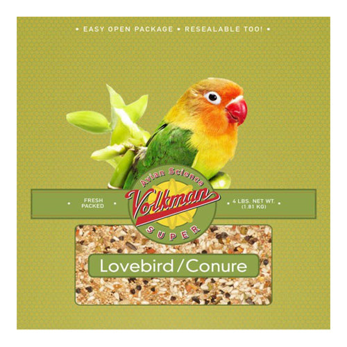 Product Description Volkman Avian Science Lovebird & Conure Food is a nourishing daily diet made especially for Lovebirds and Conures. The variety of delicious and healthy ingredients includes red and white millet, canary grass seed, safflower seed, sunflower chips, diced carrots, papaya and shredded coconut. This special blend is naturally preserved with orange oil and has been cleaned to ensure that it’s dust-free. It’s great for Quakers, Indian Ringnecks, Senegals, Lovebirds, Conures and similarly sized birds. A nourishing daily diet made especially for Lovebirds and Conures. It’s great for Quakers, Indian Ringnecks, Senegals, Lovebirds, Conures and similarly sized birds. The variety of delicious and healthy ingredients includes red and white millet, canary grass seed, safflower seed, sunflower chips, diced carrots, papaya and shredded coconut. This special blend is naturally preserved with orange oil and has been cleaned to ensure that it’s dust-free. Product Benefits Ingredients Suggestions Special Note Warnings DisclaimerPeta2z.com offers nationally branded products that are produced according to manufacturing standards set by regulators at everyday low prices. Do not use unproven, unbranded products, which can pose serious risks to your health.