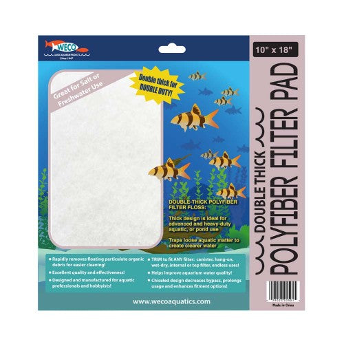 Product Description Weco Double-Thick Polyfiber Filter Pad is double thick for advanced and heavy-duty aquatic, or pond use. Great for salt and freshwater use. Traps loose aquatic matter to create clearer water. Rapidly removes floating particulate organic debris for easier cleaning! Excellent quality and effectiveness! Designed and manufactured for aquatic professionals and hobbyists. Trim to fit any filter: canister, hang-on, wet-dry, internal or top filter, endless uses! Helps improve aquarium water quality. Chiseled design decreases bypass, prolongs usage and enhances fitment options. Package is designed with freshwater fish on one side and saltwater fish on the other to suit your stores display needs. Product Benefits Ingredients Suggestions Special Note Warnings DisclaimerPeta2z.com offers nationally branded products that are produced according to manufacturing standards set by regulators at everyday low prices. Do not use unproven, unbranded products, which can pose serious risks to your health.