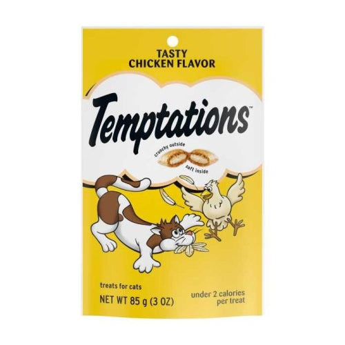 Product Description Cats can’t resist the delectable taste of TEMPTATIONS, so give your cat these purrfect TEMPTATIONS Classic Cat Treats… they’ll come running the moment you open the tub. Each of these low calorie chicken flavor cat snacks has less than 2 calories and provides an irresistible combination of both crunchy and soft textures. These healthy cat treats also come in a cat-proof, stay-fresh tub, so your feline friend can enjoy their favorite snack when you open it, but never when they shouldn’t! These TEMPTATIONS Classic Cat Treats are a perfect addition to your cat’s normal feeding routine: Use them as a treat, a meal, or a cat food topper. They also are the perfect size treats for cat toys... try mixing up playtime by placing a few inside a treat dispensing toy and watch your cat chase and swat away. * Based on 2020 Nielsen sales data Contains one (1) 6.3 oz. pouch of TEMPTATIONS Classic Cat Treats Tasty Chicken Flavor. Your adult cat can’t wait to get their paws on these scrumptious cat food treats that are crunchy on the outside and soft on the inside. Under 2 calories per chicken flavor cat treat, so you can feel good about rewarding your cat every day. TEMPTATIONS Cat Treats are 100% nutritionally complete and balanced for adult cat maintenance and can be used as a treat, meal, or cat food topper. Treat ’em again and again with this value-sized, resealable tub: perfect for keeping cat paws off when you’re not watching. America’s #1 Cat Treat Brand*… just shake the pack and they’ll come running. AAFCO Formulated. Product Benefits Ingredients Suggestions Special Note Warnings DisclaimerPeta2z.com offers nationally branded products that are produced according to manufacturing standards set by regulators at everyday low prices. Do not use unproven, unbranded products, which can pose serious risks to your health.