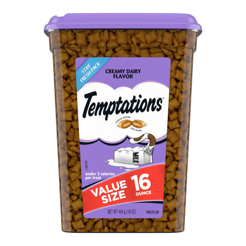 Product Description Cats can’t resist the delectable taste of TEMPTATIONS, so give your cat these purrfect TEMPTATIONS Classic Cat Treats… they’ll come running the moment you open the tub. Each of these low calorie creamy dairy flavor cat snacks has less than 2 calories and provides an irresistible combination of both crunchy and soft textures. These healthy cat treats also come in a cat-proof, stay-fresh tub, so your feline friend can enjoy their favorite snack when you open it, but never when they shouldn’t! These TEMPTATIONS Classic Cat Treats are a perfect addition to your cat’s normal feeding routine: Use them as a treat, a meal, or a cat food topper. They also are the perfect size treats for cat toys... try mixing up playtime by placing a few inside a treat dispensing toy and watch your cat chase and swat away. * Based on 2020 Nielsen sales data Contains one (1) 16 oz. tub of TEMPTATIONS Classic Cat Treats Creamy Dairy Flavor. Your adult cat can’t wait to get their paws on these scrumptious cat food treats that are crunchy on the outside and soft on the inside. Under 2 calories per cat treat, so you can feel good about rewarding your cat every day. TEMPTATIONS Cat Treats are 100% nutritionally complete and balanced for adult cat maintenance and can be used as a treat, meal, or cat food topper. Treat ’em again and again with this value-sized, resealable tub: perfect for keeping cat paws off when you’re not watching. America’s #1 Cat Treat Brand*… just shake the pack and they’ll come running. AAFCO Formulated. Product Benefits Ingredients Suggestions Special Note Warnings DisclaimerPeta2z.com offers nationally branded products that are produced according to manufacturing standards set by regulators at everyday low prices. Do not use unproven, unbranded products, which can pose serious risks to your health.
