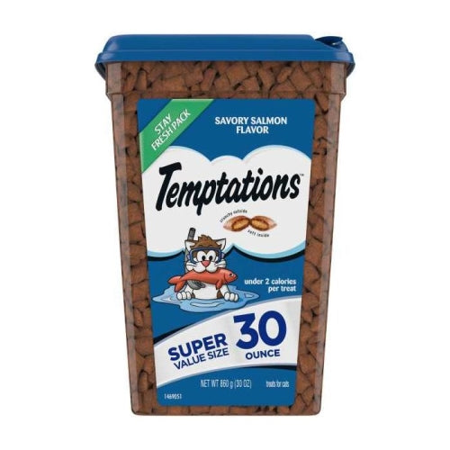 Product Description Cats can’t resist the delectable taste of TEMPTATIONS, so give your cat these purrfect TEMPTATIONS Classic Cat Treats… they’ll come running the moment you open the pack. Each of these tasty salmon flavor cat food treats has less than 2 calories and provides an irresistible combination of both crunchy and soft textures. They also come in a cat-proof, super value-sized tub, so your feline friend can enjoy plenty of their favorite seafood snack when you open it… but never when they shouldn’t! These TEMPTATIONS Classic Cat Treats are a perfect addition to your cat’s normal feeding routine: Use them as a treat, a meal, or a cat food topper. * Based on 2019 Nielsen sales data Contains one (1) 30 oz. tub of TEMPTATIONS Classic Cat Treats Savory Salmon Flavor. Your cat can’t wait to get their paws on these scrumptious fish flavor cat food treats that are crunchy on the outside and soft on the inside. Under 2 calories per salmon flavor cat treat, so you can feel good about rewarding your cat every day. TEMPTATIONS Cat Treats are 100% nutritionally complete and balanced for adult cat maintenance and can be used as a treat, meal, or cat food topper. Treat ’em again and again with this super value-sized resealable tub: perfect for keeping cat paws off when you’re not watching. America’s #1 Cat Treat Brand*… just shake the pack and they’ll come running. *Based on 2019 Nielsen sales data. AAFCO Formulated. Product Benefits Ingredients Suggestions Special Note Warnings DisclaimerPeta2z.com offers nationally branded products that are produced according to manufacturing standards set by regulators at everyday low prices. Do not use unproven, unbranded products, which can pose serious risks to your health.